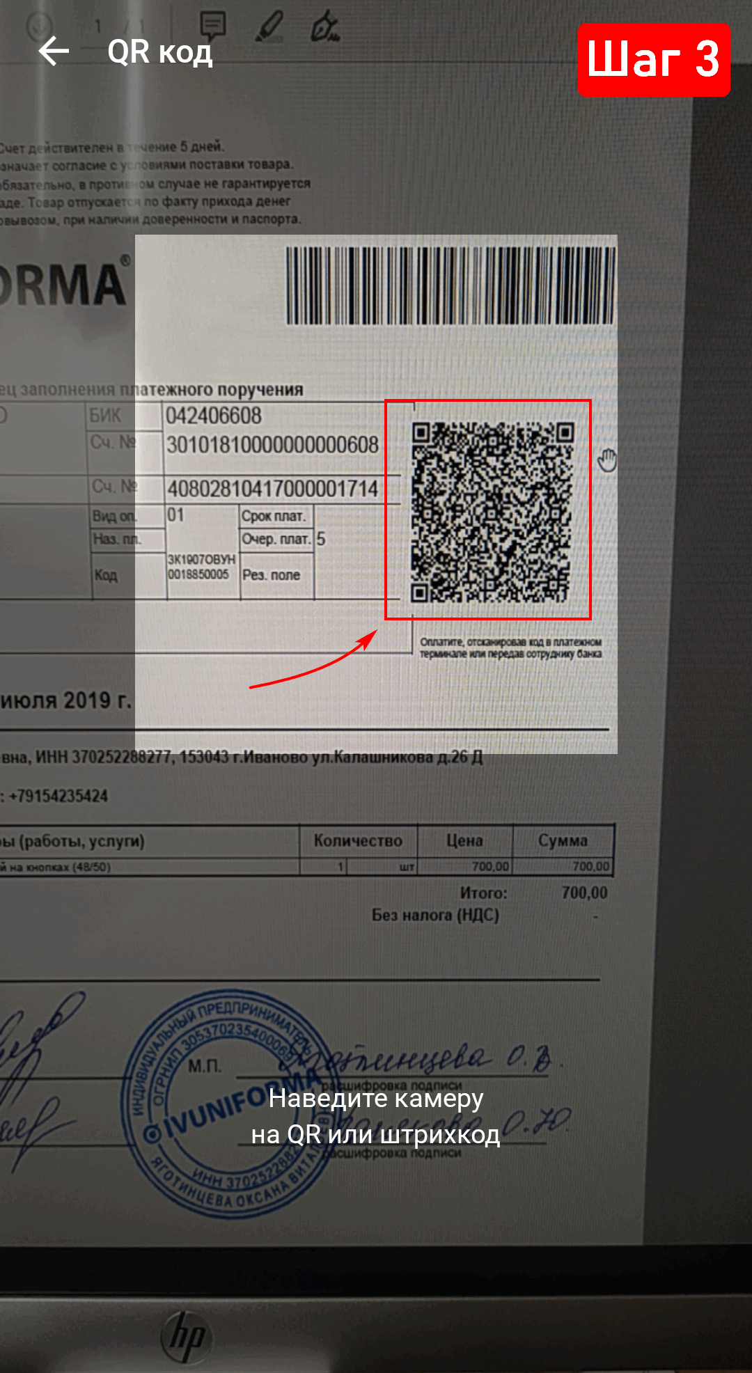 3. Разрешите приложению доступ к камере и наведите объектив на квадратный штрихкод в правой части счёта.