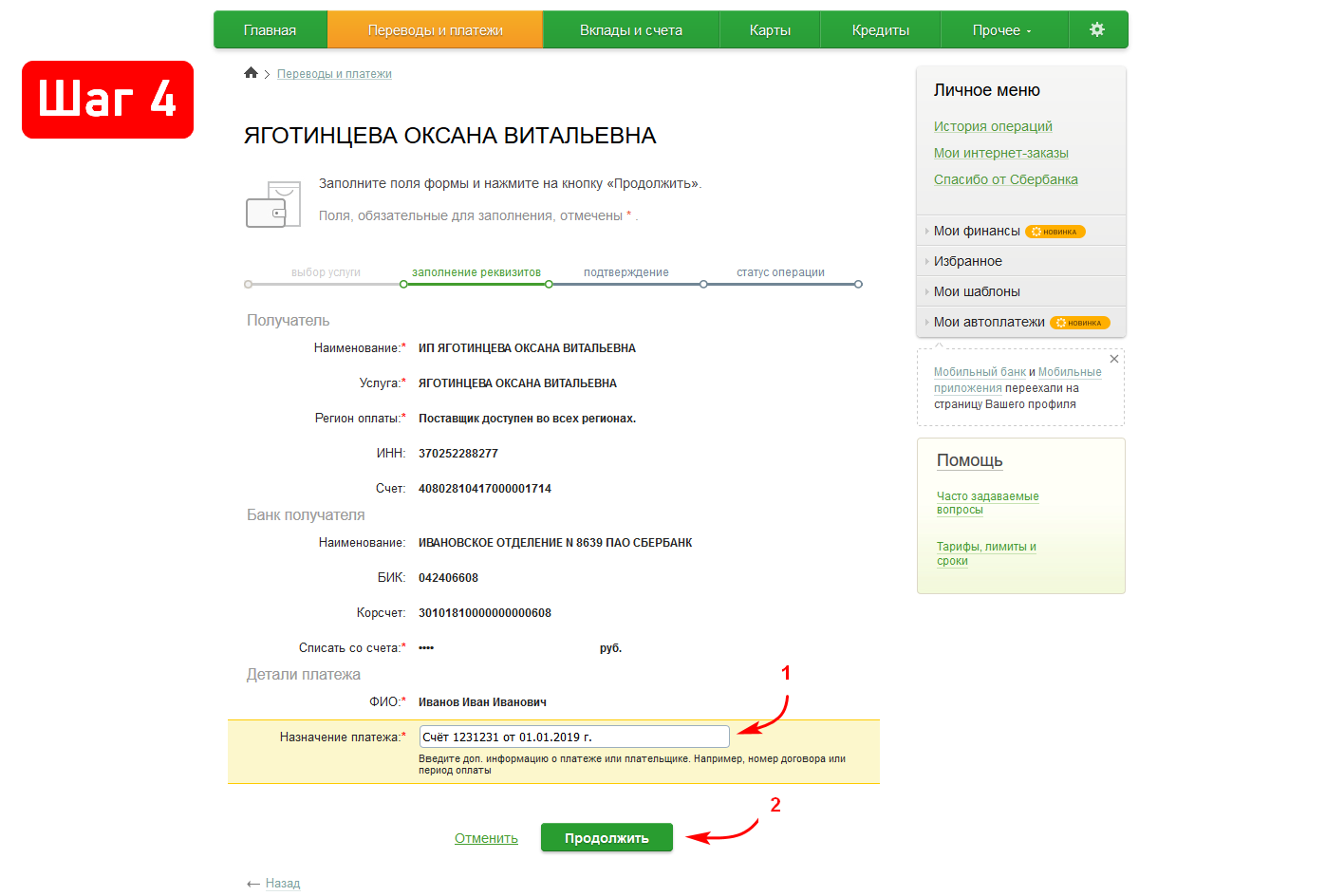 3. Теперь необходимо ввести ФИО плательщика, назначение платежа и указать сумму для оплаты счёта. После заполнения каждого поля требуется нажать на кнопку «Продолжить». В поле «Назначения платежа» укажите номер счёта и дату его выставления.