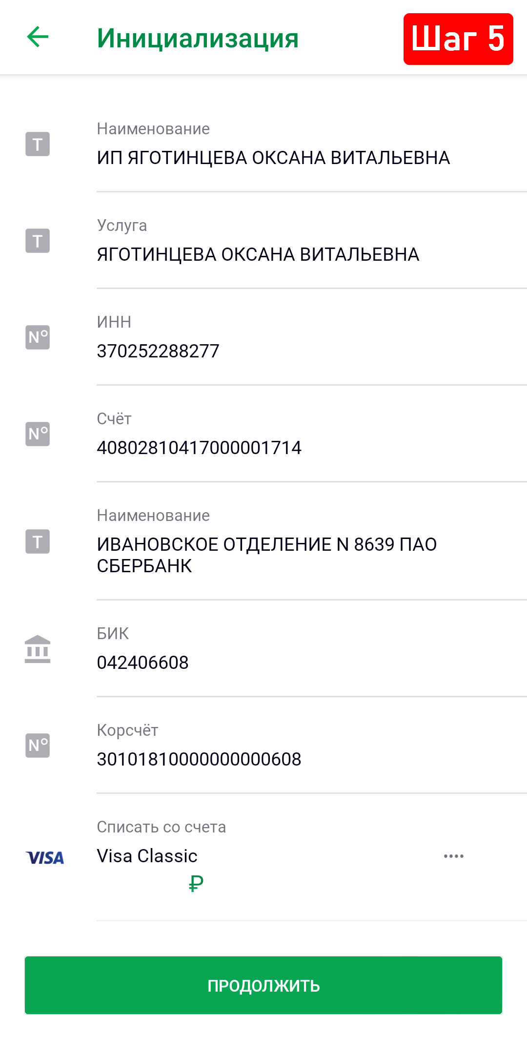 5. Перед вами откроется экран с данными для оплаты, если всё указано верно, нажмите «Продолжить».
