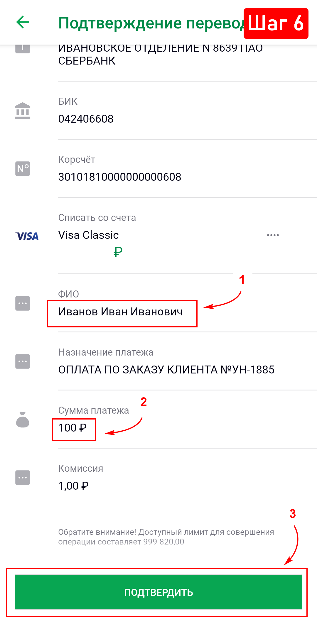 6. Прокрутите вниз, введите ФИО и сумму оплаты. Для завершения нажмите на кнопку «Подтвердить».