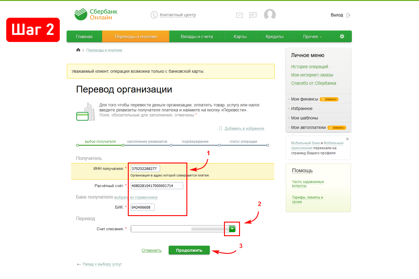 Далее необходимо выбрать карту, с которой будет происходить перевод средств и нажать на кнопку «Продолжить».