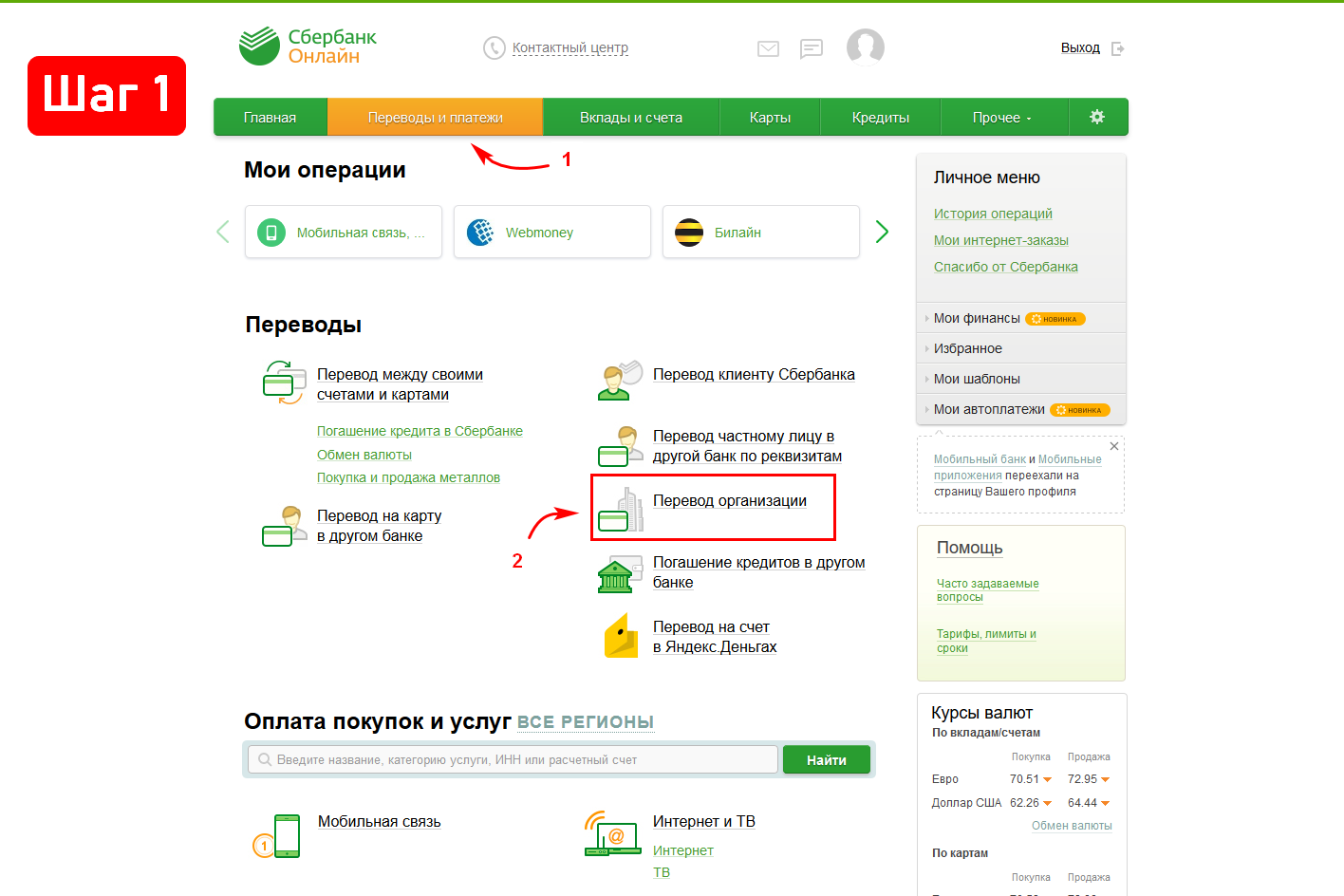 1. Для начала авторизуйтесь в системе банка. После удачного входа, выберите раздел «Переводы и платежи» в горизонтальном меню. В данном разделе найдите пункт «Перевод организации» и кликните по нему.